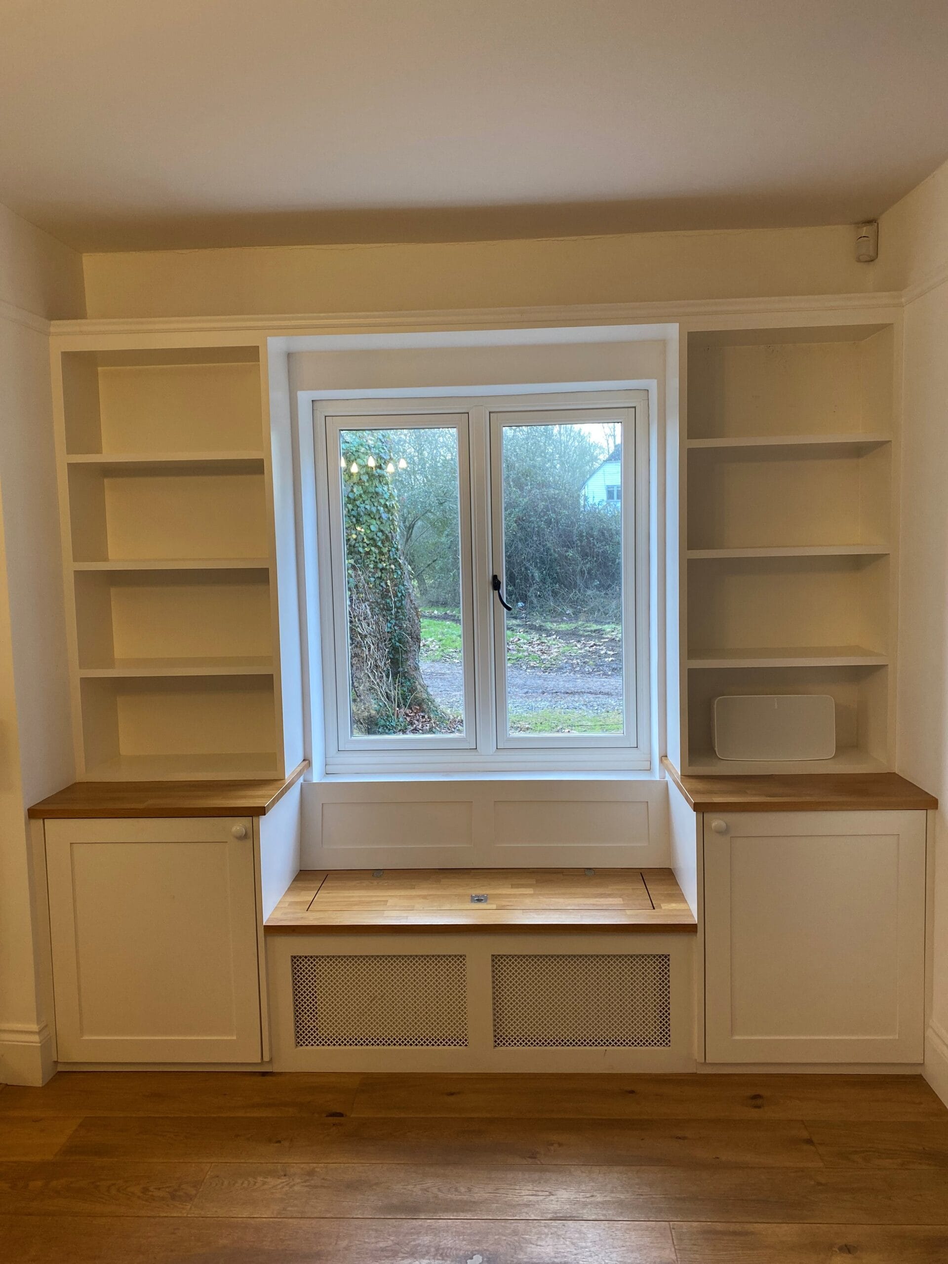 In compact city homes around Jericho, Headington, and Summertown, we often create alcove shelving, wall-to-wall units, or under-window storage that brings order without reducing floor space. For modern apartments in Bicester or Eynsham, floating shelves, integrated media units, and multi-purpose cabinetry can transform tight living areas into organised, stylish spaces.